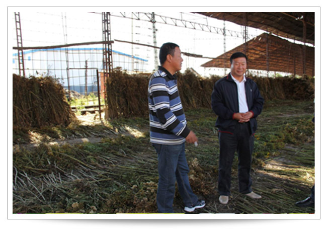 下圖為公司董事長徐有章(右)查看內(nèi)蒙古種植基地晾曬區(qū),公司正式建立種植基地后,為返魂草的晾曬搭建了涼棚,防止陽光暴曬和雨水影響返魂草的質(zhì)量,采取遮陽措施后的返魂草藥材內(nèi)在質(zhì)量更高。